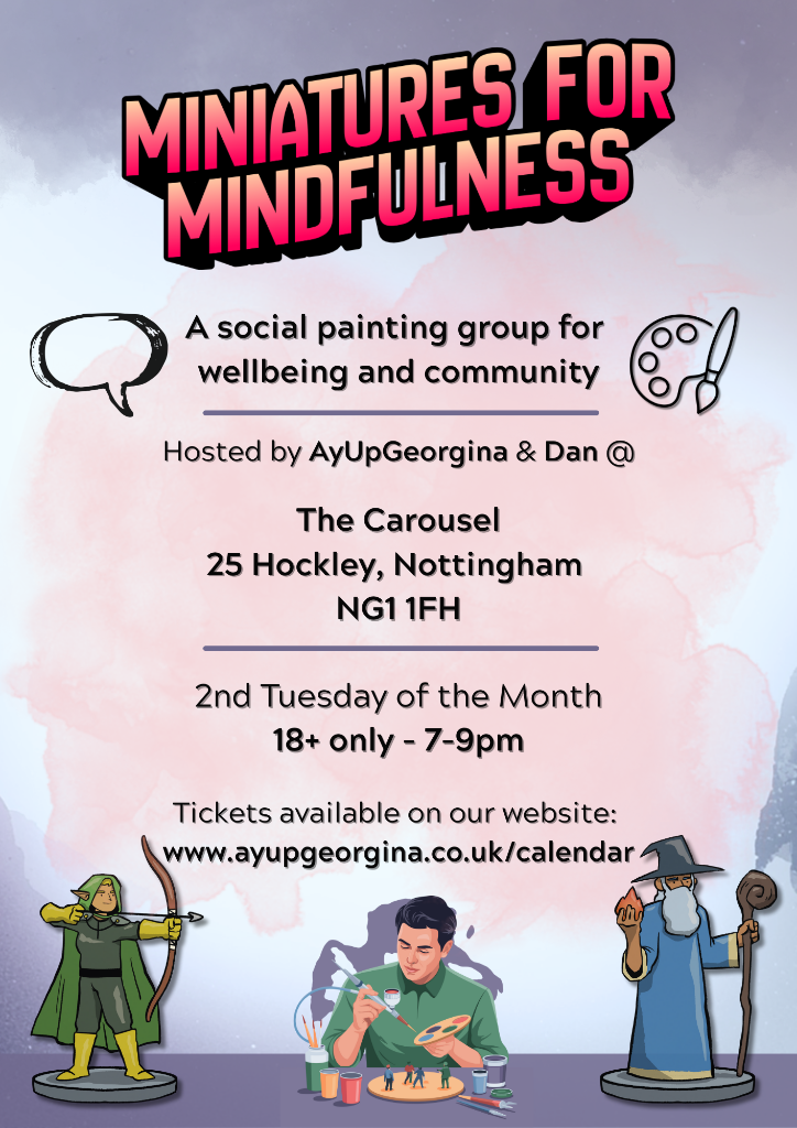 Please join us at The Carousel for a monthly social miniature-painting event hosted by Ay Up Georgina and Dan. This is an evening dedicated to painting miniatures, enjoying a nice drink, and spending time with others in a relaxed, welcoming environment. Bring your miniatures, your paints, and enjoy a night of community and painting.