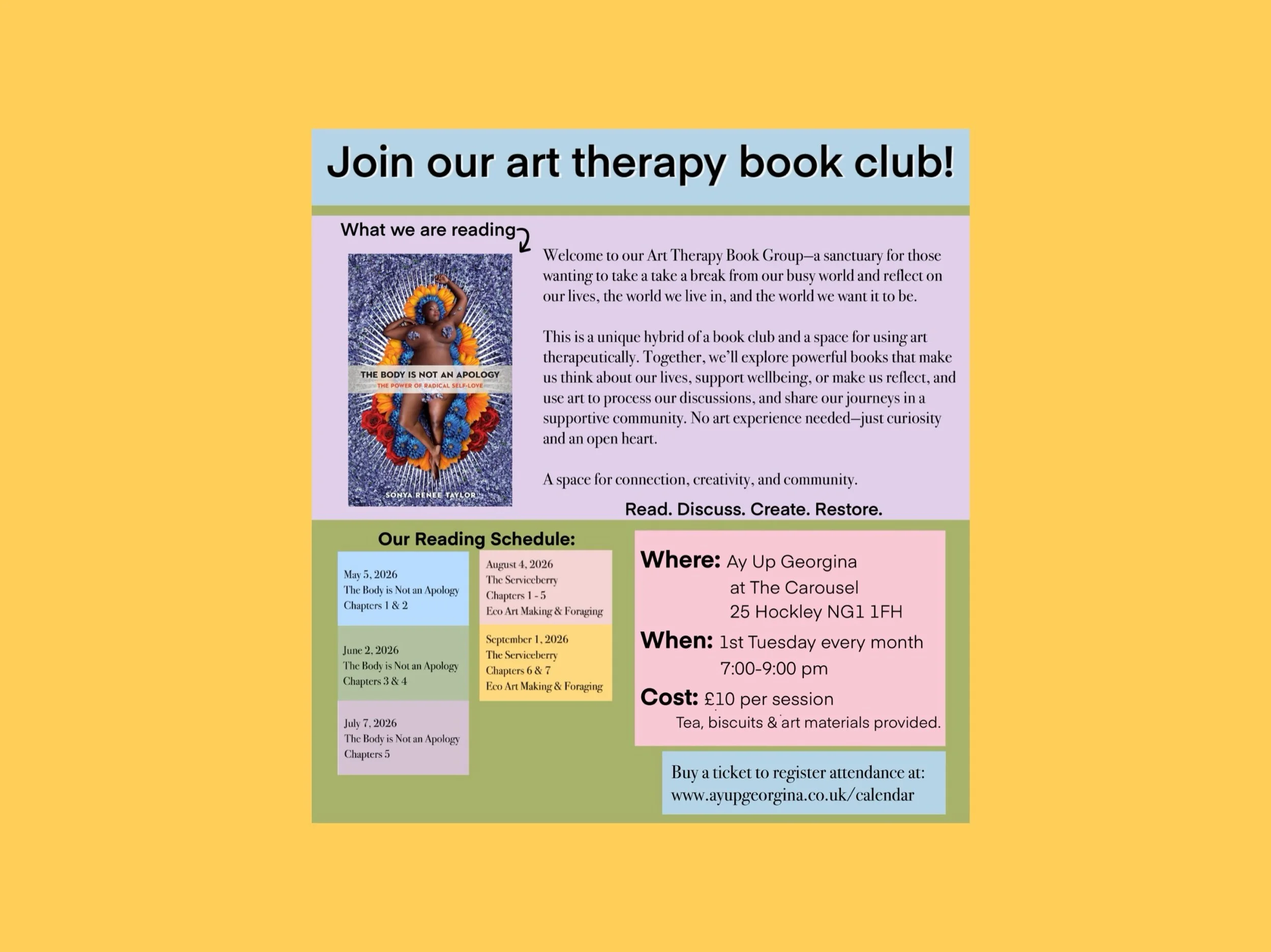 Disclaimer: With this club being a hybrid space, I want to clarify that this is not a therapy group but a book club that will use art making to process our discussions within it. This event is being held in a community space with a bar/cafe present and book club members may be drinking alcohol during the event if they chose to. Tea and biscuits will be provided within the group. If you are interested in art psychotherapy and processing trauma or stress please reach out to me for 1-1 art therapy sessions.