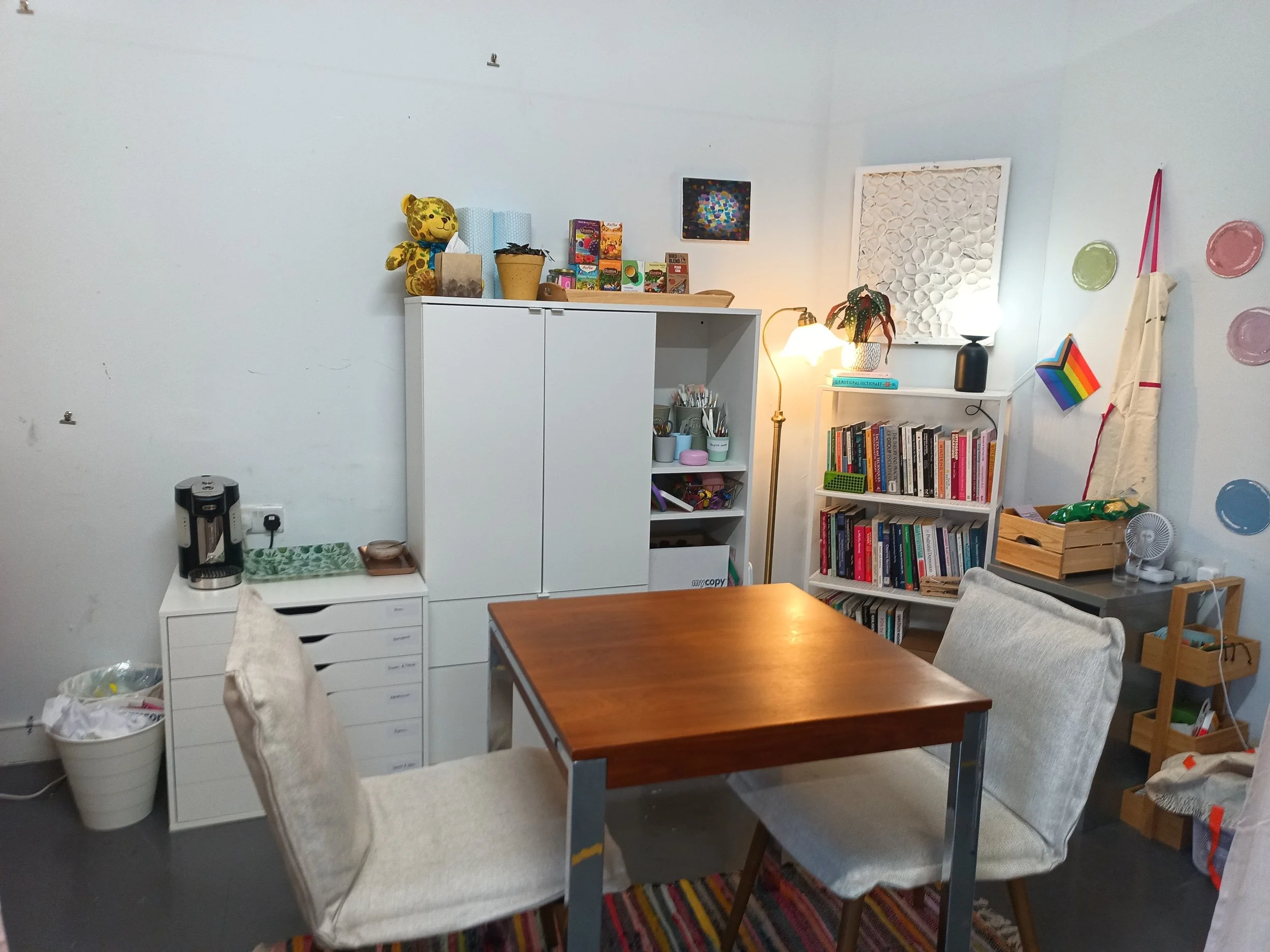 The studio is designed to be your sanctuary. It has been a carefully created a sensory-friendly environment where your comfort comes first. Get cosy with fuzzy blankets, fidgets, plush animals, sensory friendly lighting, and lots of tea!